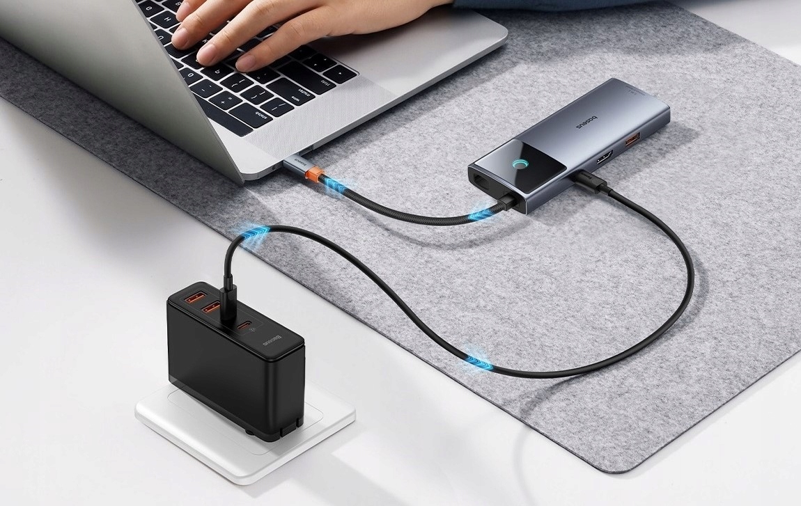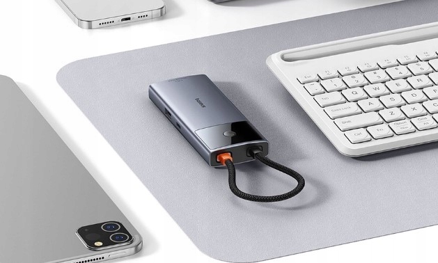 Port USB-C PD (100W): Ten port wspiera ładowanie z mocą do 100W, co umożliwia szybkie i efektywne ładowanie laptopów oraz innych urządzeń zasilanych przez USB-C, nawet podczas korzystania z pozostałych portów HUBa.