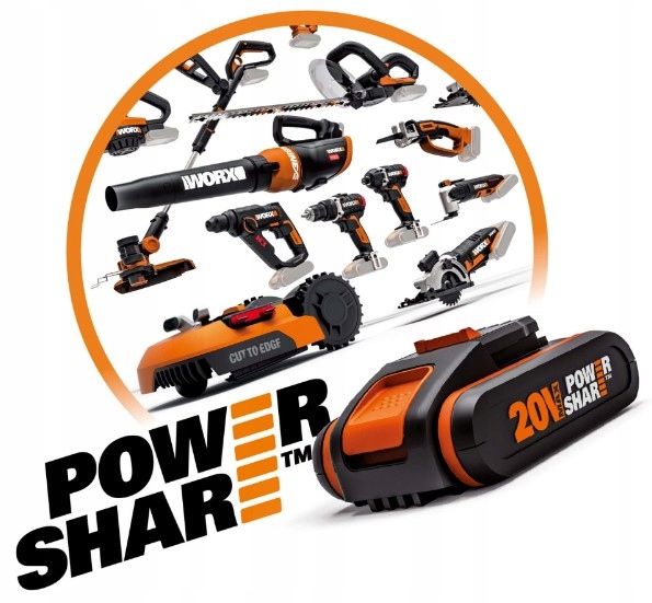 Dzięki WORX PowerShare możesz używać tej samej baterii do wszystkich bezprzewodowych narzędzi WORX: wiertarek, wkrętarek, kosiarek, pił, wyrzynarek i wielu innych.