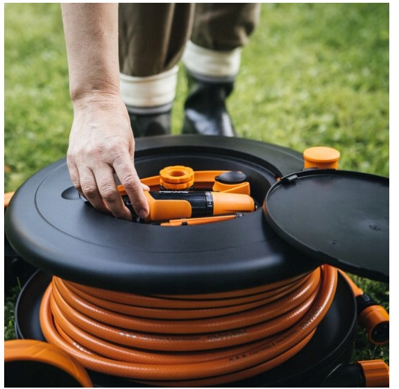 Bęben z wężem M – gotowy do użycia zestaw, zawierający wszystkie niezbędne akcesoria potrzebne do łatwego podlewania ogrodów oraz użytkowania na tarasie i patio. Wyposażony jest w wysokiej jakości wąż ogrodowy o długości 20 metrów i średnicy 13 mm (1/2”), dyszę zraszającą, przyłącze kranowe multi (pasujące do kranów o trzech najbardziej popularnych średnicach) oraz podpórkę pod dyszę zraszającą. Dodatkowo posiada zintegrowany schowek do wygodnego przechowywania akcesoriów.