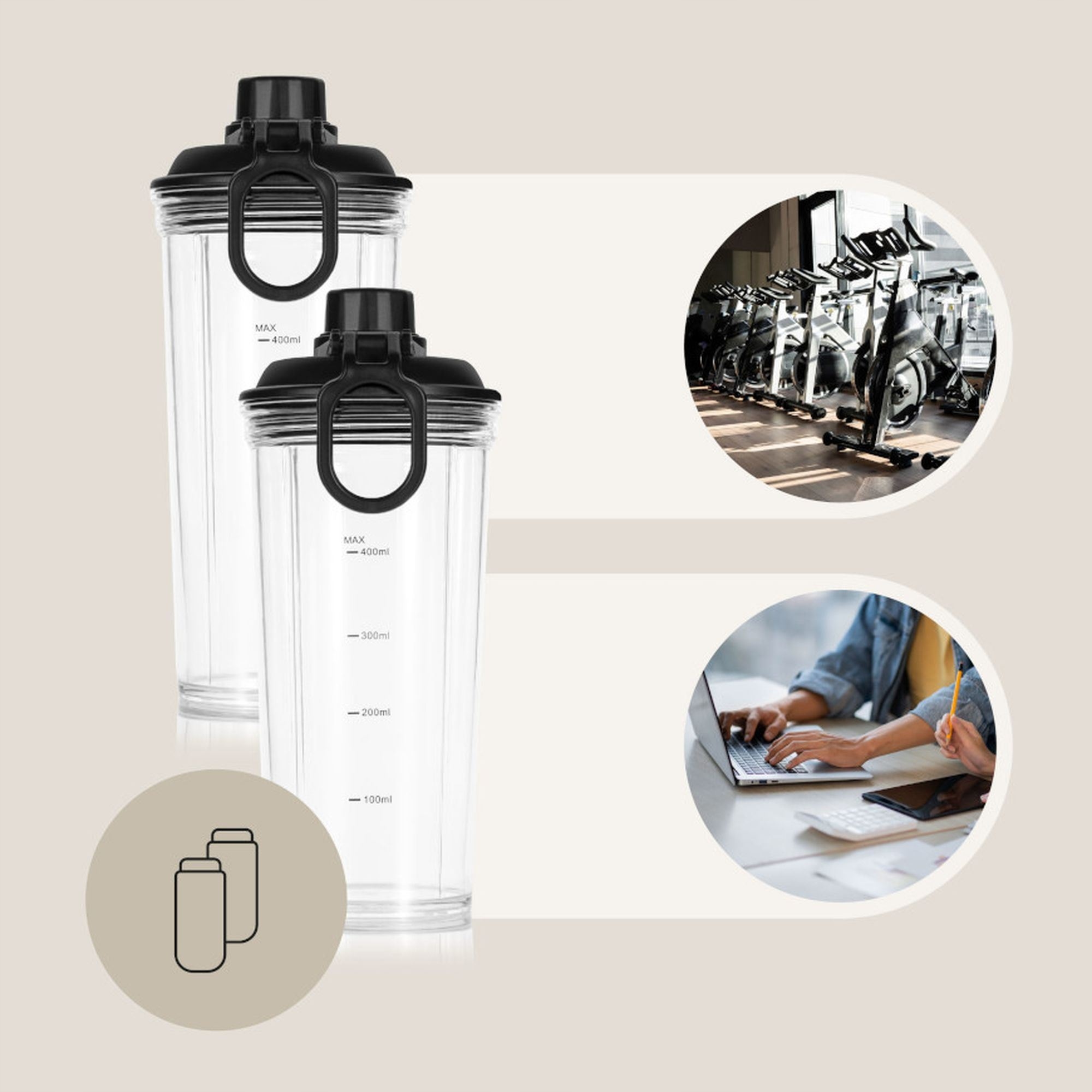 W zestawie z blenderem Vitamine Base znajdują się dwie poręczne butelki o pojemności 630 ml (400 ml pojemności użytkowej), które pozwalają zabrać ze sobą na trening lub w podróż przygotowany koktajl, smoothie lub napój białkowy . Każda z butelek jest wyposażona w szczelną pokrywę oraz funkcjonalną miarkę mililitrową umieszczoną na boku .