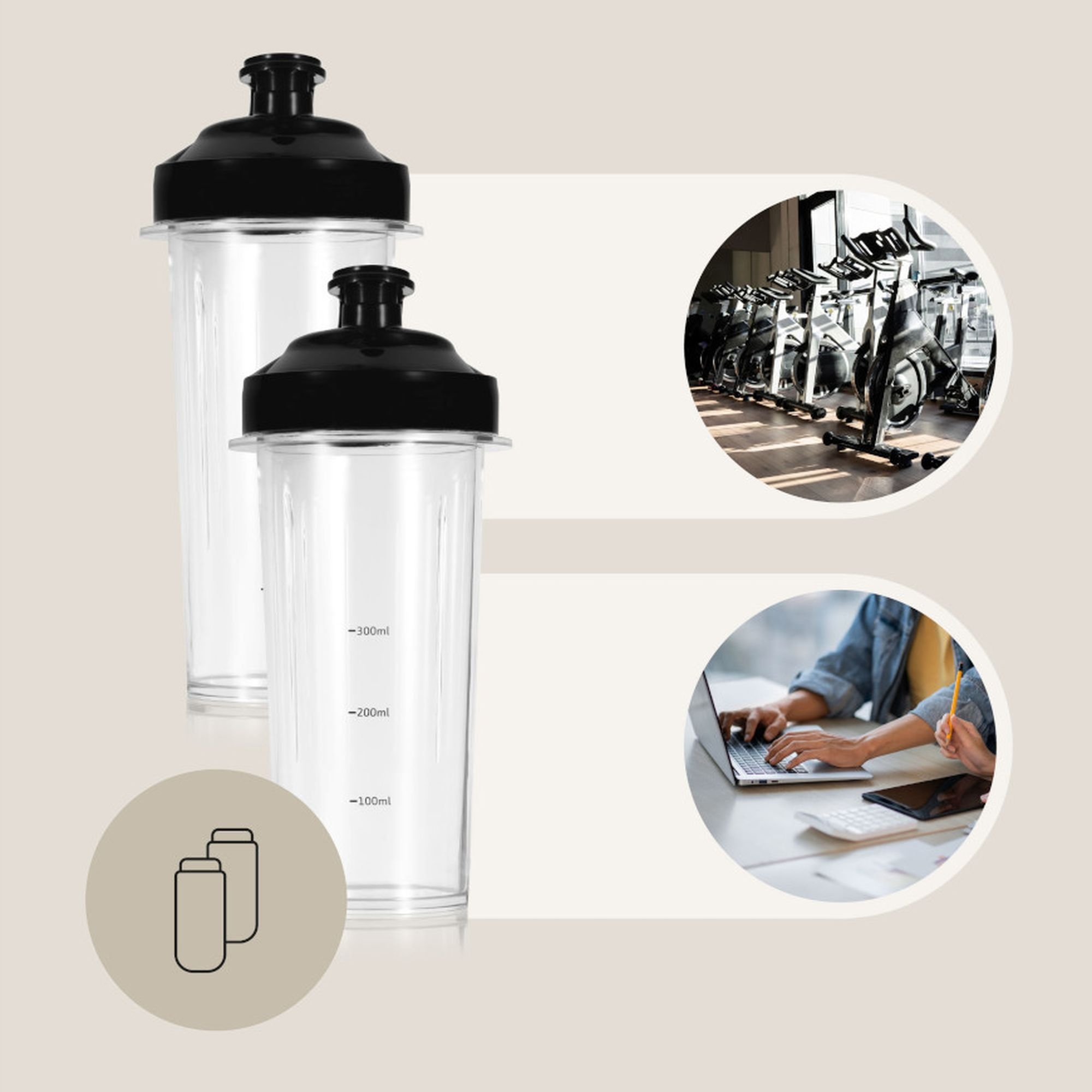 W zestawie znajdziesz dwie butelki o pojemności 630 ml (pojemność użytkowa 300 ml) z wygodnymi pokrywami , dzięki którym możesz zabrać swoje ulubione koktajle, smoothie czy shake’i gdziekolwiek zechcesz . Idealne do pracy, na siłownię, w podróż lub na szybkie śniadanie w biegu . Butelki są lekkie, poręczne i szczelne , co zapewnia komfort użytkowania i przechowywania.