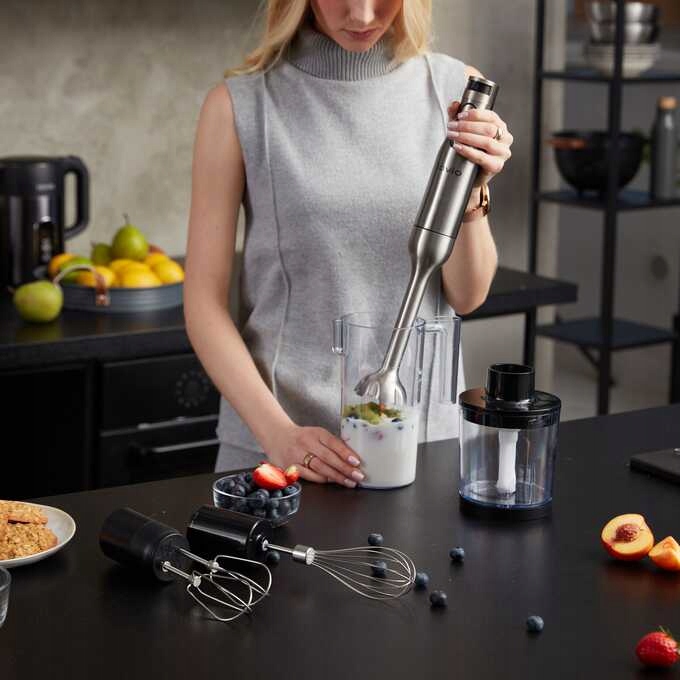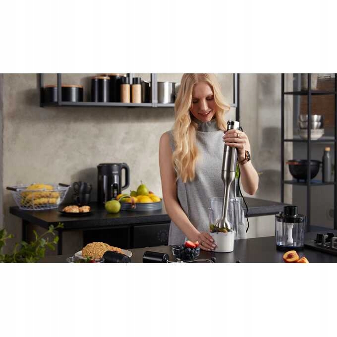 - Załączone wyposażenie: końcówka blendująca, końcówka do ubijania, malakser, pojemnik, przykrywka, rozdrabniacz, stacja/uchwyt do przechowywania