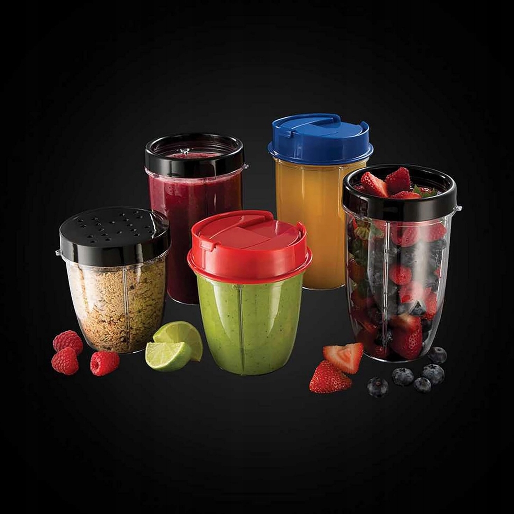 - Zestaw zawiera 15 elementów: baza, 3 x 700 ml duże kubki, 2 x 350 ml małe kubki, 1 x ostrza z sześcioma nożykami, 1 x podwójne ostrza, 2 x pełne nakrętki, 2 x nakrętki z dziubkiem, 1 x nakrętka do posypywania, 2 x pokrywki z ustnikiem