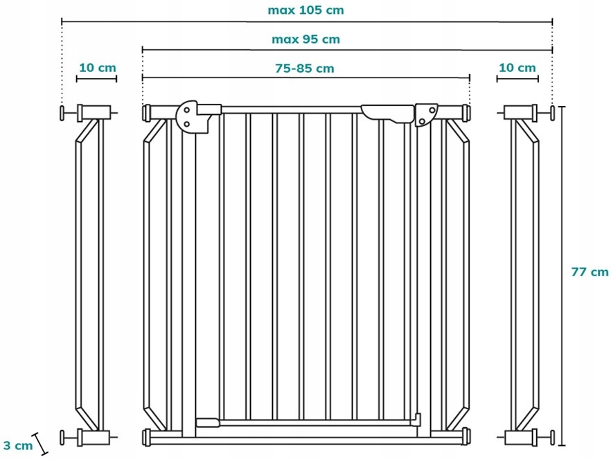 Barierka spełnia wymogi EN 1930:2011. Niniejsza barierka przeznaczona jest wyłącznie do użytku domowego. Barierka bezpieczeństwa jest odpowiednia do użytkowania przez dzieci w wieku do 24 miesięcy. Szerokość otworowa, do których zaprojektowana jest barierka: 75 - 85 cm do 105 cm z przedłużkami. Barierka zamykana manualnie. Barierka rozporowa - montaż wyłącznie na płaskiej, stabilnej powierzchni za pomocą wkrętów.