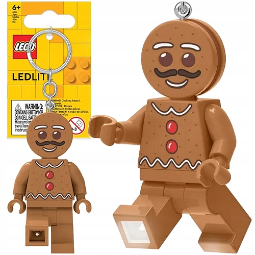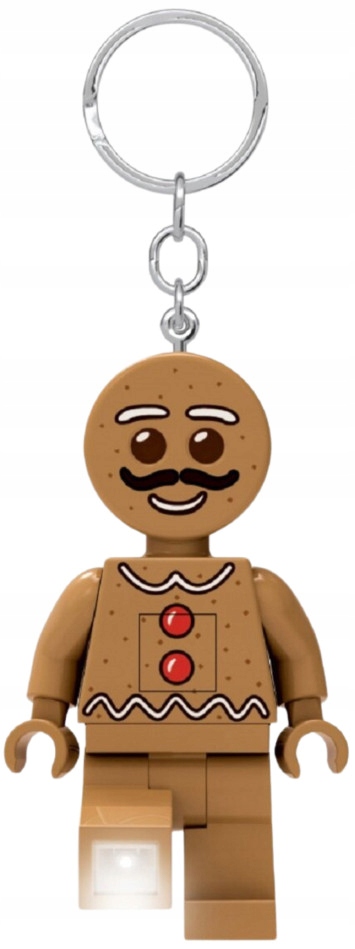 - Breloczek z latarką i piernikowym ludkiem zawiera dużą, w pełni ruchomą minifigurkę LEGO® piernikowego ludka z dwiema lampkami LED w obydwu nogach. Figurka jest przymocowana do mocnego łańcuszka z kółkiem