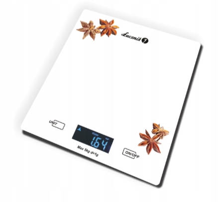 Elektroniczna waga kuchenna o maksymalnym załadunku 5000 g, z wyświetlaczem LCD, wskaźnikiem wyczerpania baterii, funkcją tary oraz z funkcją automatycznego wyłączania. Platforma ze szkła hartowanego z foto folią.