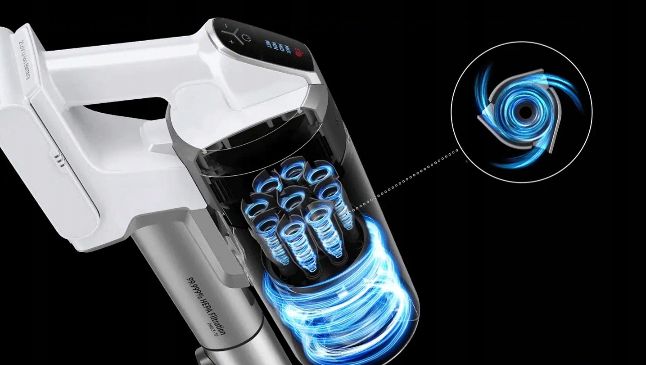Dzięki wysokowydajnej, wielocyklonowej technologii Jet Cyclone możesz cieszyć się czystszym powietrzem i ekstremalną mocą ssącą. System obejmujący 9 cyklonów i 27 wlotów powietrza tworzy optymalną ścieżkę, która umożliwia zminimalizowanie strat ssania. Jednocześnie wychwytuje drobne cząsteczki kurzu.