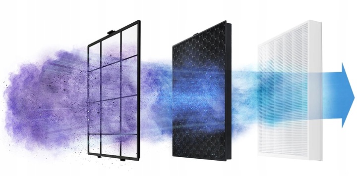 Dzięki wielowarstwowemu, wysokowydajnemu systemowi oczyszczania powietrze w Twoim domu zawsze będzie idealnie czyste. Nadający się do mycia pod bieżącą wodą filtr wstępny wyłapuje większe cząstki pyłu. Wykonany z węgla aktywowanego filtr przeciwzapachowy usuwa toksyczne gazy*. Następnie niezwykle precyzyjny filtr przeciwpyłowy, który dzięki ładunkom elektrostatycznym wyłapuje nawet do 99.97% najdrobniejszych cząstek pyłu**.