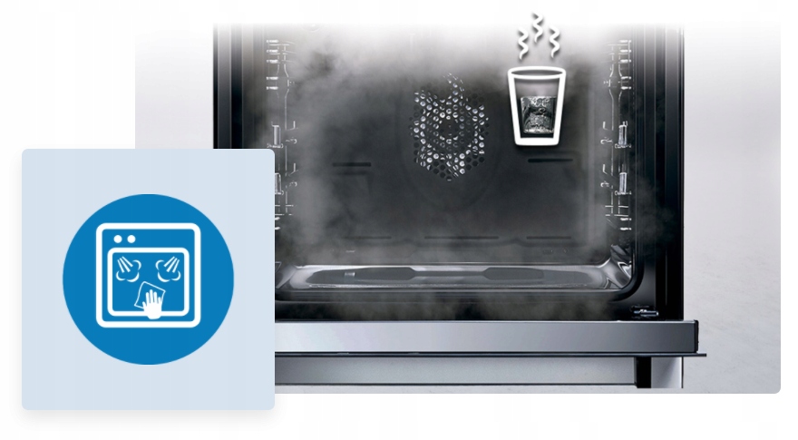 Ten piekarnik z łatwością doprowadzisz do porzadku dzięki cichej mocy pary wodnej. Po prostu wylej trochę wody w komorze piekarnika i włącz odpowiedni program, by para wodna osadziła się na jego ściankach, ułatwiając ich czyszczenie.