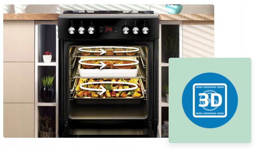 Pieczenie 3D to nowa generacja pieczenia, która aktywuje wszystkie elementy grzewcze obecne w danym modelu i działa wielowymiarowo. Grzałki piekarnika działają sekwencyjnie dla równego rozłożenia ciepła w całym wnętrzu. Pieczenie 3D pozwala także piec kilka potraw jednocześnie.