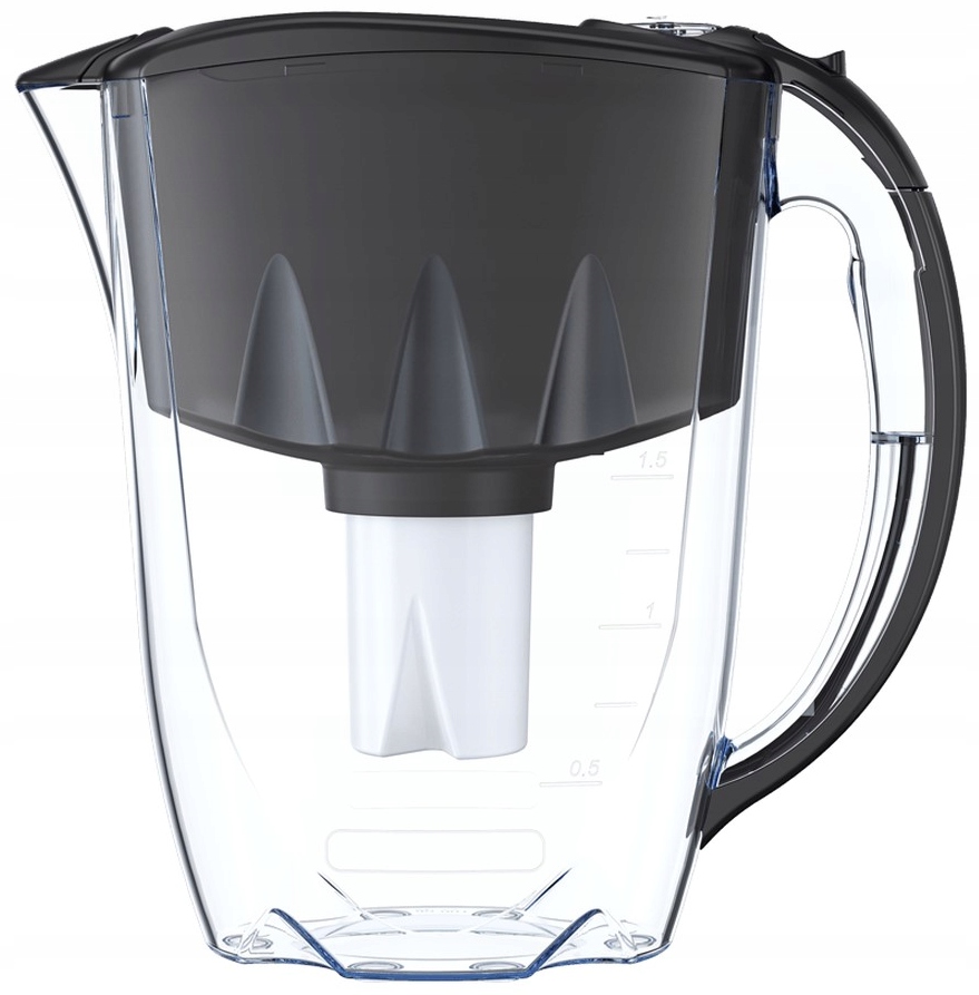Kompaktowa budowa i wyjątkowy kształt sprawiają, że dzbanek jest ergonomiczny, poręczny i wygodny w użytkowaniu. Żebrowana pokrywka typu "Slider" ułatwia nalewanie wody bez jej zdejmowania, a umieszczony na pokrywce mechaniczny wskaźnik zużycia wkładu, informuje kiedy należy wymienić wkład.