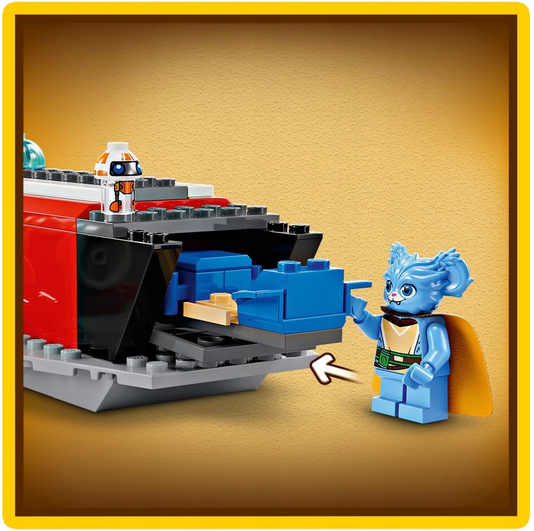 - Proste budowanie — Karmazynowy Jastrząb zawiera klocek startowy ułatwiający budowanie oraz kokpit z miejscem dla wszystkich trzech postaci. Z tyłu statku zmieści się też ścigacz