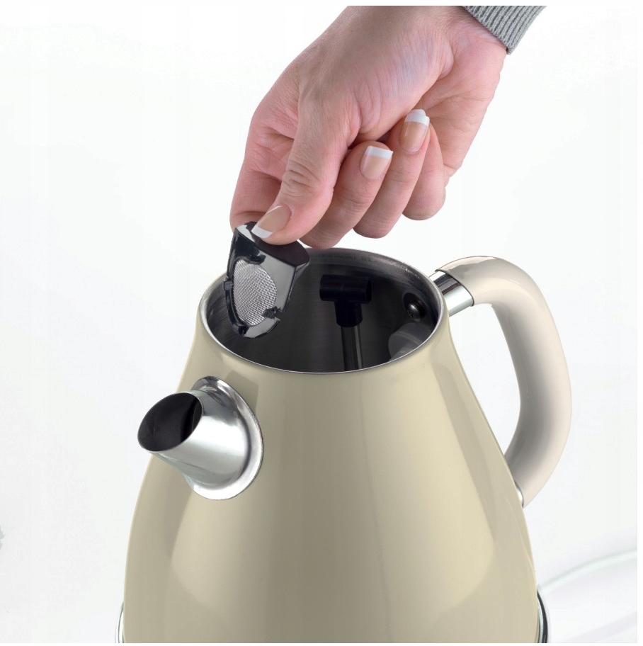 Elegancki czajnik elektryczny z linii Vintage, moc 2000 W, automatyczny wyłącznik, kontroler STRIX, metalowy korpus z chromowanymi elementami wykończenia, płaska grzałka płytowa, uchwyt typu soft touch, wskaźnik poziomu wody, wyjmowany wewnętrzny filtr kamienia, obrotowa podstawa 360° ze schowkiem na kabel, pojemność 1,7 l, wymiary 22x22x30,5 cm