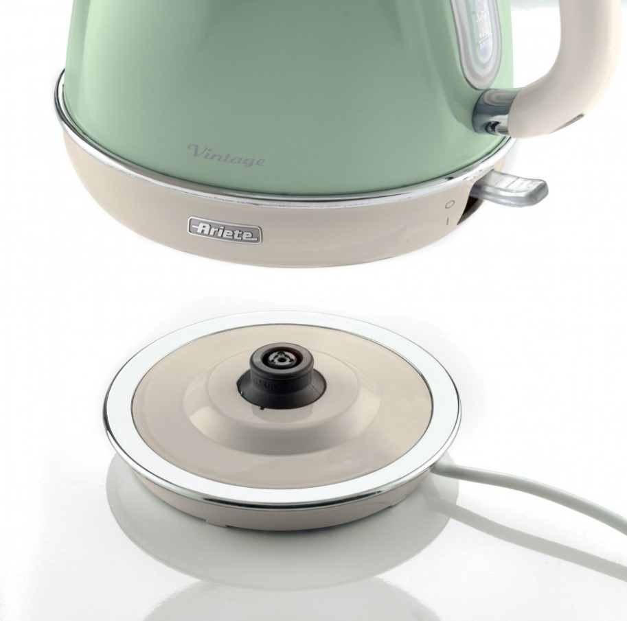 Czajnik Ariete Vintage zosta? wyposa?ony w obrotow? podstaw?, kt?ra u?atwia jego u?ytkowanie. Bezprzewodowy korpus czajnika mo?esz postawi? na stole, by uzupe?nia? na bie??co zapas herbaty czy zi?? podczas ?niadania lub obiadu. Czajnik Vintage nie tylko ugotuje wod?, ale r?wnie? ozdobi Tw?j rodzinny st??. Wyj?tkowy kszta?t i nieprzeci?tny kolor uczyni?y z tego czajnika prawdziw? kuchenn? dekoracj?!