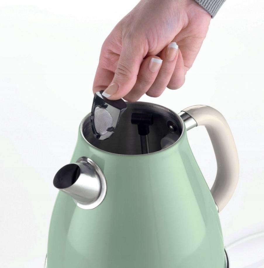 Elegancki czajnik elektryczny z linii Vintage, moc 2000 W, automatyczny wy??cznik, kontroler STRIX, metalowy korpus z chromowanymi elementami wyko?czenia, p?aska grza?ka p?ytowa, uchwyt typu soft touch, wska?nik poziomu wody, wyjmowany wewn?trzny filtr kamienia, obrotowa podstawa 360? ze schowkiem na kabel, pojemno?? 1,7 l, wymiary 22x22x30,5 cm