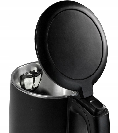 Czajnik w kolorze czarnym o pojemności 1,5 litra, posiadający zabezpieczenie przed przegrzaniem i automatyczne wyłączanie.