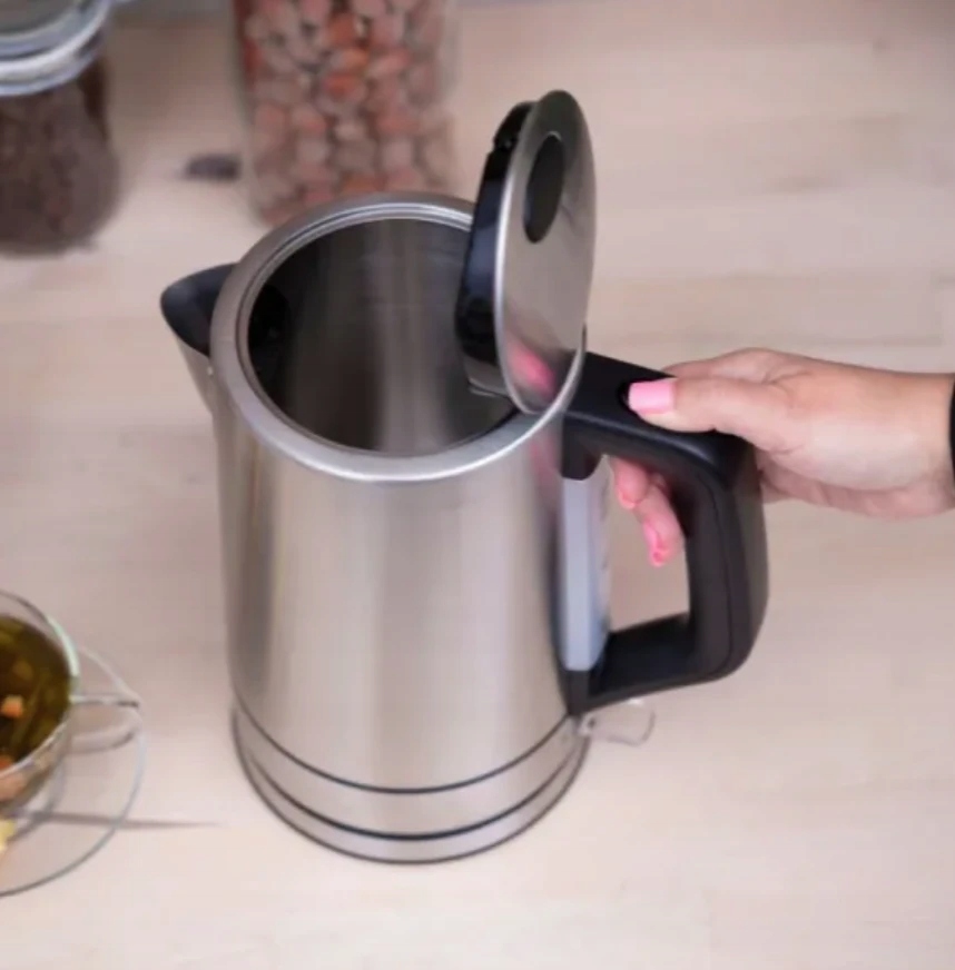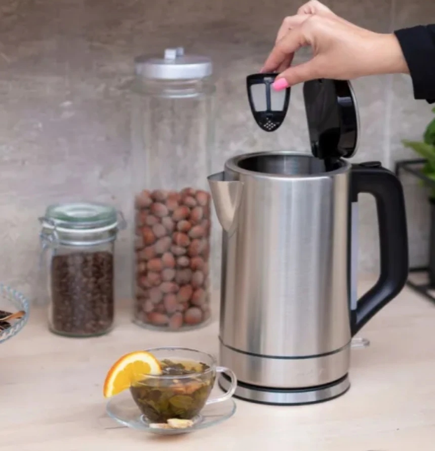 Nie musisz zdjemowa? pokrywki, aby nala? wody do wn?trza czajnika. Jedn? d?oni? mo?esz chwyci? r?czk? urz?dzenia i u?ywaj?c przycisku otworzy? pokryw?. Wystarczy podstawi? czajnik pod kran i gotowe. Uchylna pokrywa u?atwia tak?e czyszczenie i odkamienianie.