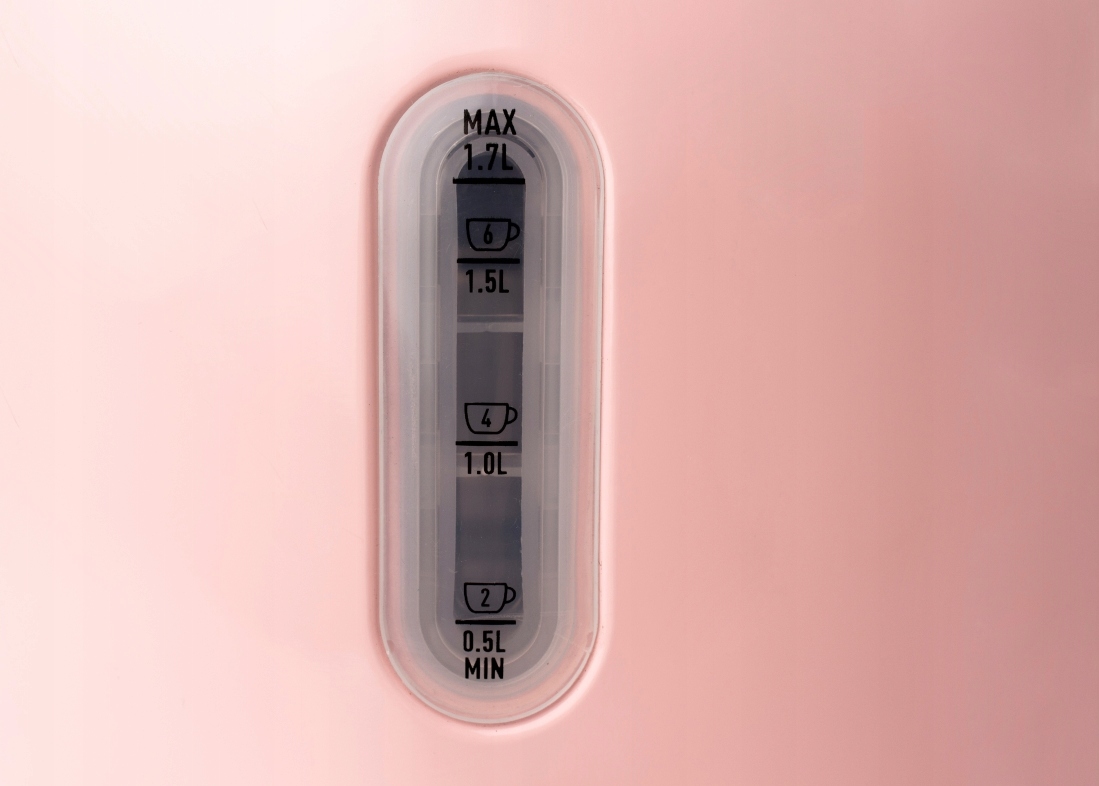 Czajnik o pojemności 1,7 L. Poziom wody zaznaczony na dwa sposoby: skalą litrową oraz liczbą filiżanek. Możliwość przygotowania maksymalnie 7 filiżanek herbaty na raz.