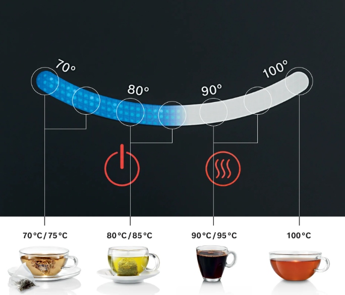 Ka?dy rodzaj herbaty potrzebuje odpowiedni? temperatur? parzenia do wydobycia pe?ni aromatu. Ustaw odpowiedni? temperatur?: 7 ustawie? temperatur : 70?C, 75?C, 80?C, 85?C, 90?C, 95?C i 100?C. Ciesz si? prysznym aromatem herbaty.