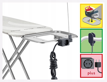- Wyposażona w gniazdko elektryczne i antenkę podtrzymującą kabel żelazka