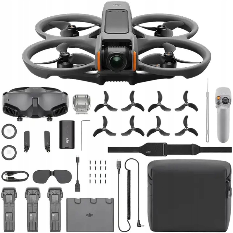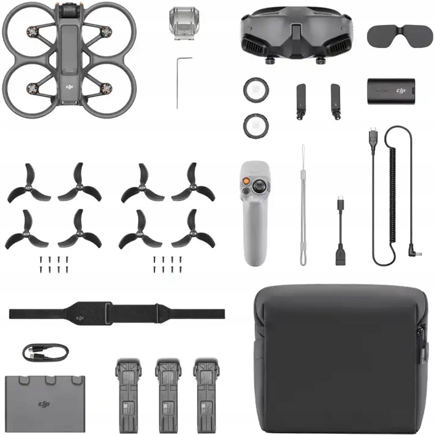 - DJI Avata 2, DJI RC Motion 2, Smycz do DJI RC Motion 2, Inteligentny akumulator do DJI Avata 2, Hub do ładowania akumulatorów DJI Avata 2, DJI Goggles 2, Osłona ekranu DJI Goggles 2, Oprawki do okularów DJI Goggles 2 (para), Opaska na głowę DJI Goggles 2, Kabel zasilający DJI Goggles 2, Antena DJI Goggles 2 (Dual-Band), Akumulator do DJI Goggles 2, Śmigła do DJI Avata 2 (para), Osłona gimbala DJI Avata 2, Kabel USB-C do USB-C PD, Kabel OTG, Śrubokręt, Śruba do śmigieł DJI Avata 2, Torba na ramię DJI