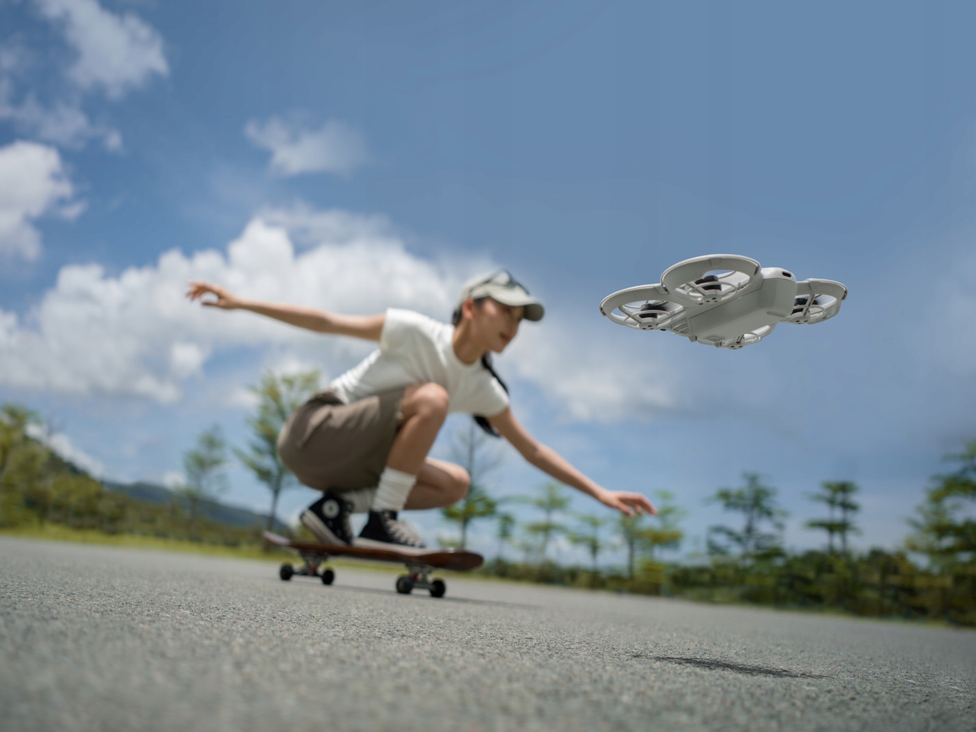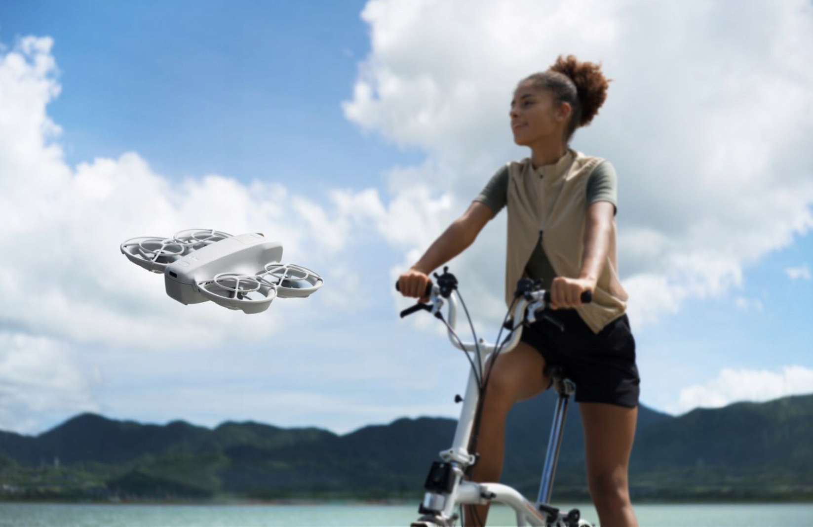 DJI Neo utrzymuje Cię w doskonałej ramce podczas jazdy na rowerze, łyżwach lub pieszych wędrówkach, zapewniając urzekające zdjęcia, które bez wysiłku dotrzymują kroku Twojemu tempu.