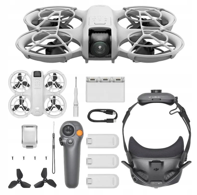 - Załączone wyposażenie: 3 x Inteligentny akumulator DJI Neo|4 x Zapasowa śruba śmigła|DJI Goggles N3|DJI RC Motion 3|Dron DJI Neo|Dwukierunkowy hub do ładowania|Kabel PD (USB-C-USB-C)|Osłona gimbala|Osłona śmigieł (para)|Piankowa wyściółka do DJI Goggles N3|Smycz|Wkrętak|Zapasowe śmigła (para)