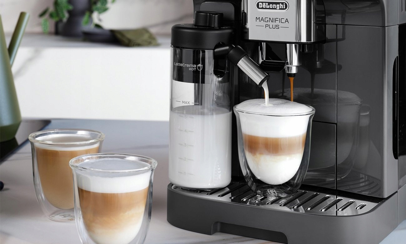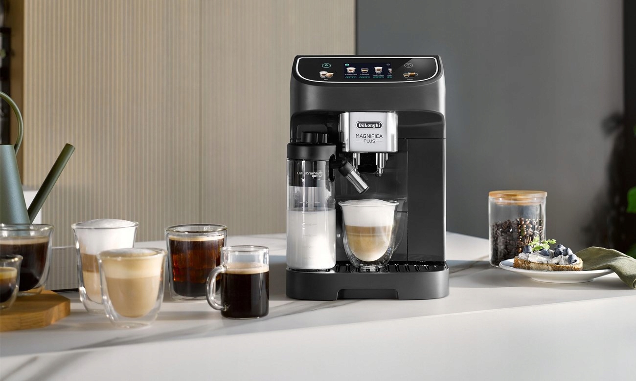 Magnifica Plus De’Longhi oferuje do 15 receptur dostępnych za dotknięciem jednego przycisku. Niezależnie od tego, czy masz ochotę na esencjonalną, czarną kawę, czy jej mleczny wariant, wystarczy chwila, aby cieszyć się perfekcyjnie zaparzonym napojem. Pozwala przygotować włoskie klasyki, m.in. espresso, coffee, doppio+, cappuccino, latte macchiato oraz caffelatte. Dodatkowo posiada funkcje gorącej wody oraz gorącego mleka, pomocne jeśli chcesz szybko przygotować herbatę, napar z ziół, kakao czy czekoladę na gorąco