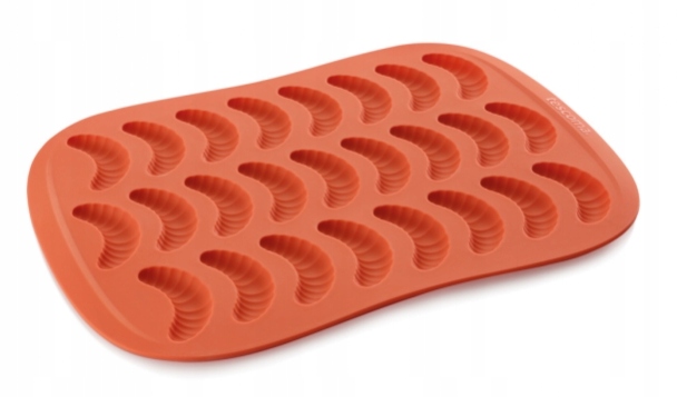 Silikonowa forma na rogaliki waniliowe o wymiarach 39 x 27 x 1 cm. Odporna na temperaturę do 230 st. Możliwość mycia w zmywarce.