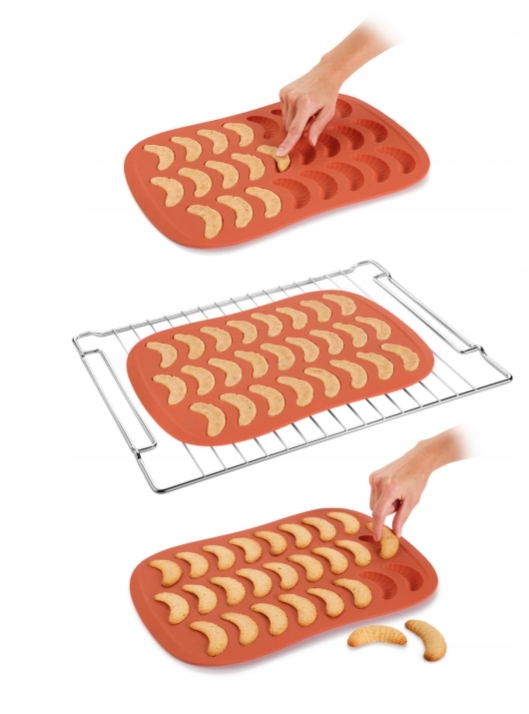 Doskonała do przygotowywania domowych rogalików waniliowych. Podczas pieczenia produkty nie przywierają do formy, pieką się szybko i równomiernie. Gotowe wypieki można łatwo wyjąć z formy. Forma została wykonana z wysokiej jakości żaroodpornego silikonu, odpornego na temperaturę do 230 °C Silikonowe formy łatwo się przechowuje oraz czyści. Po użyciu wystarczy je wypłukać lub umyć w zmywarce. Odpowiednia do piekarników gazowych, elektrycznych oraz z termoobiegiem. Instrukcja z przepisami jest częścią opakowania.