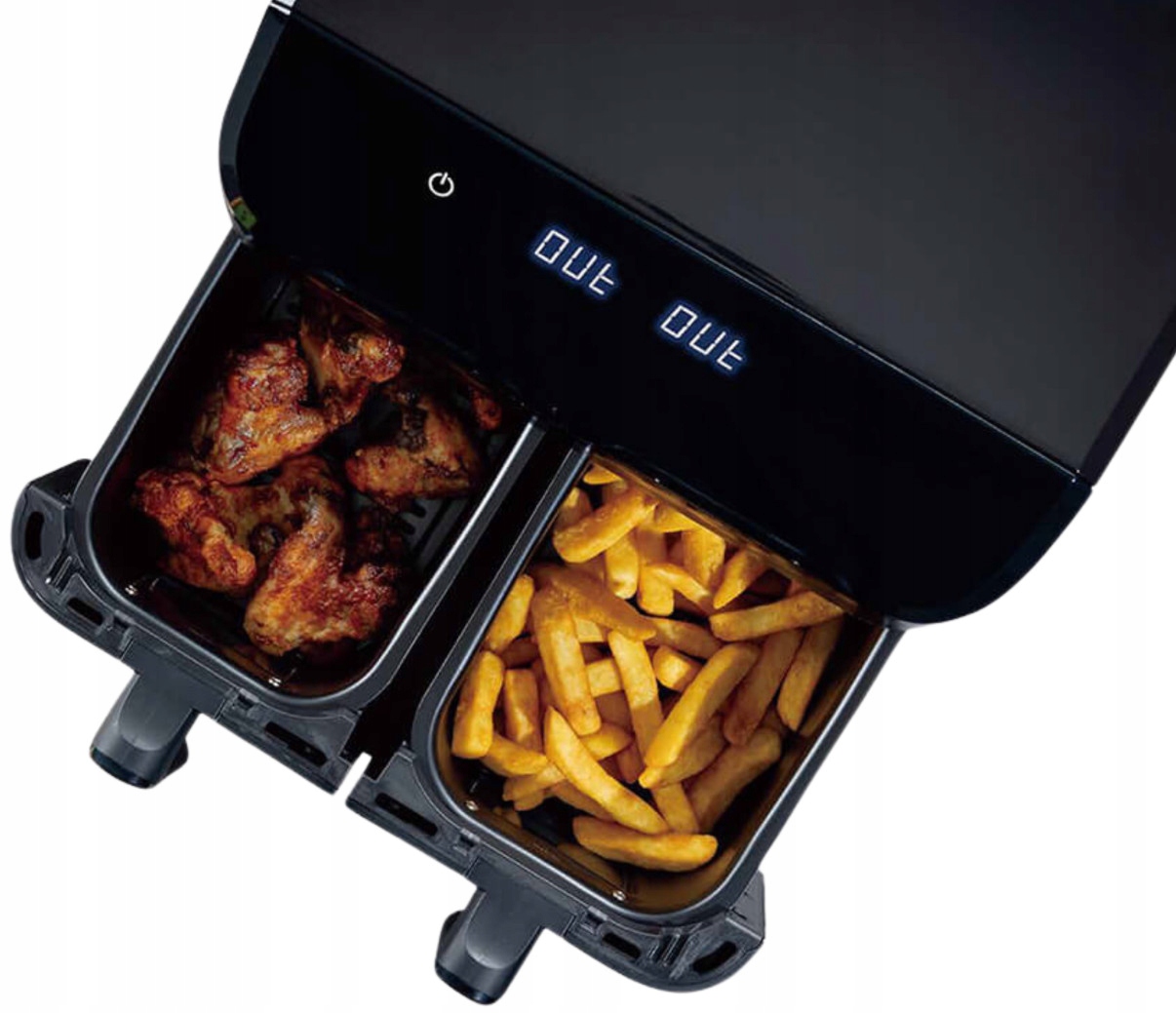 Dzięki dwóm koszom o pojemności 4,5 litra każdy, jest w stanie jednoczesnego przygotowania większej ilości dań. Kosze wyposażone w metalowe kratki oraz powłokę non stick zapewniają łatwe czyszczenie i komfort użytkowania.