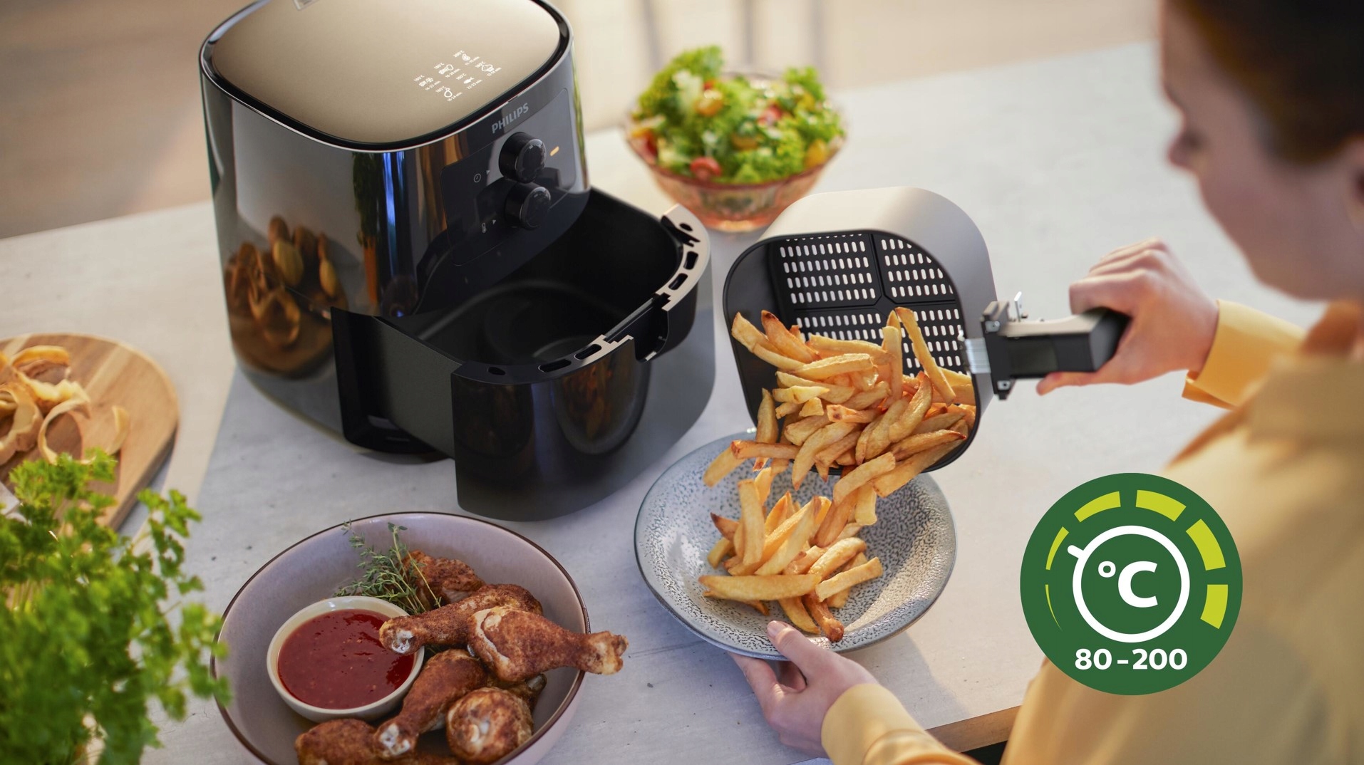 Urządzenie Airfryer firmy Philips wykorzystuje gorące powietrze, dzięki czemu Twoje ulubione potrawy są idealnie chrupiące i mają do 90% mniej tłuszczu*.