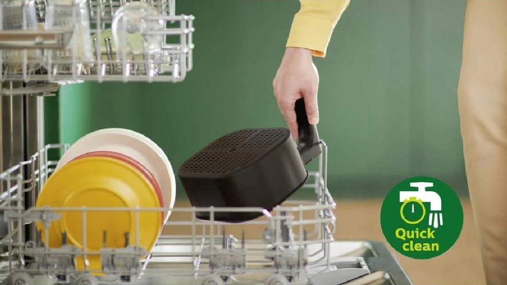 Wszystkie zdejmowane części można myć w zmywarce. Kosz QuickClean frytownicy Airfryer jest pokryty powłoką zapobiegającą przywieraniu, co ułatwia czyszczenie. Smażenie z wykorzystaniem powietrza oznacza również, że dom jest wolny od zapachu tłuszczu do smażenia.