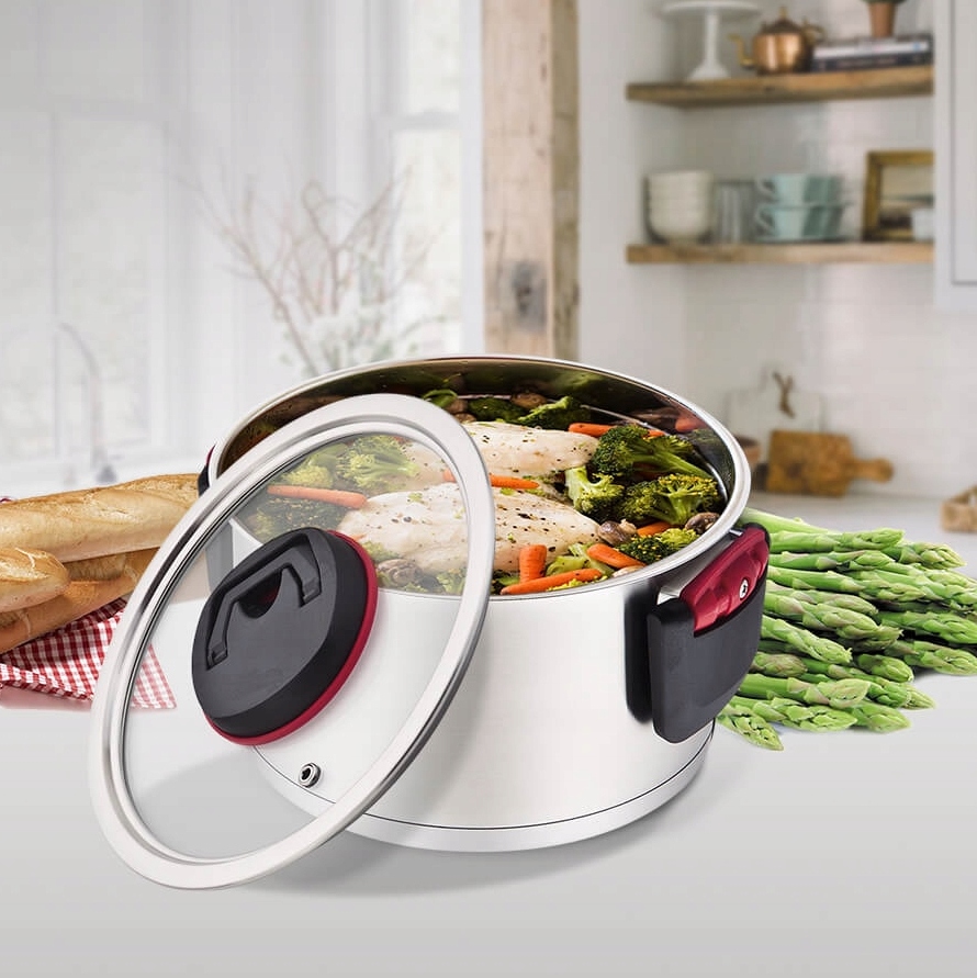 Garnek ze stali nierdzewnej, o pojemności 1,6l, posiada szklaną pokrywkę.