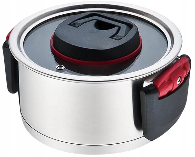 Garnek ze stali nierdzewnej, o pojemności 3,2l, posiada szklaną pokrywkę.