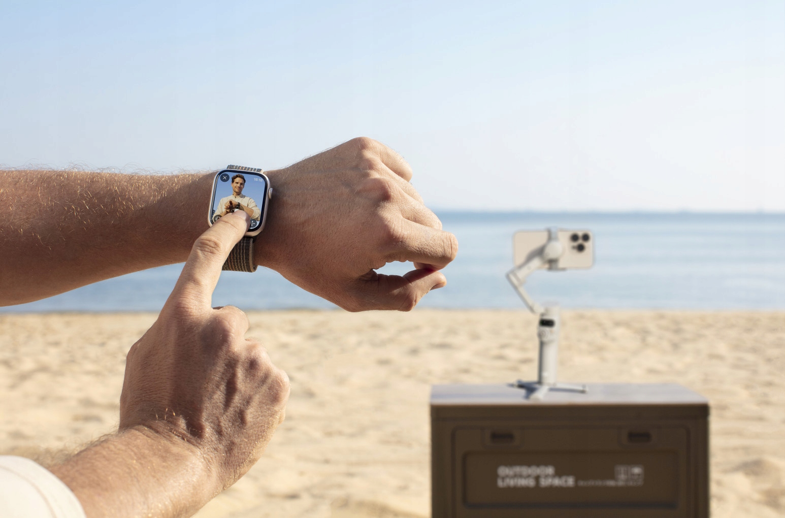 Gimbal został wyposażony w nowy magnetyczny uchwyt, który jest kompatybilny z większością smartfonów – pasuje nawet do tych modeli, które mają duże wyspy aparatów.9 Dodatkowym atutem DJI Osmo Mobile 7 jest możliwość współpracy z Apple Watchami. Możesz pobrać aplikację DJI Mimo na swój zegarek, a następnie korzystać z niego do zdalnego sprawdzania podglądu z kamery, robienia zdjęć, przełączania się między trybem portretowym a krajobrazowym, nagrywania filmów i wiele więcej.10 W oddzielnej sprzedaży znajdziesz również specjalne magnetyczne mocowanie DJI OM Magnetic Quick-Release Mount, które zostało zaprojektowane dla użytkowników iPhone’ów i umożliwia prosty, a zarazem szybki montaż sprzętu.