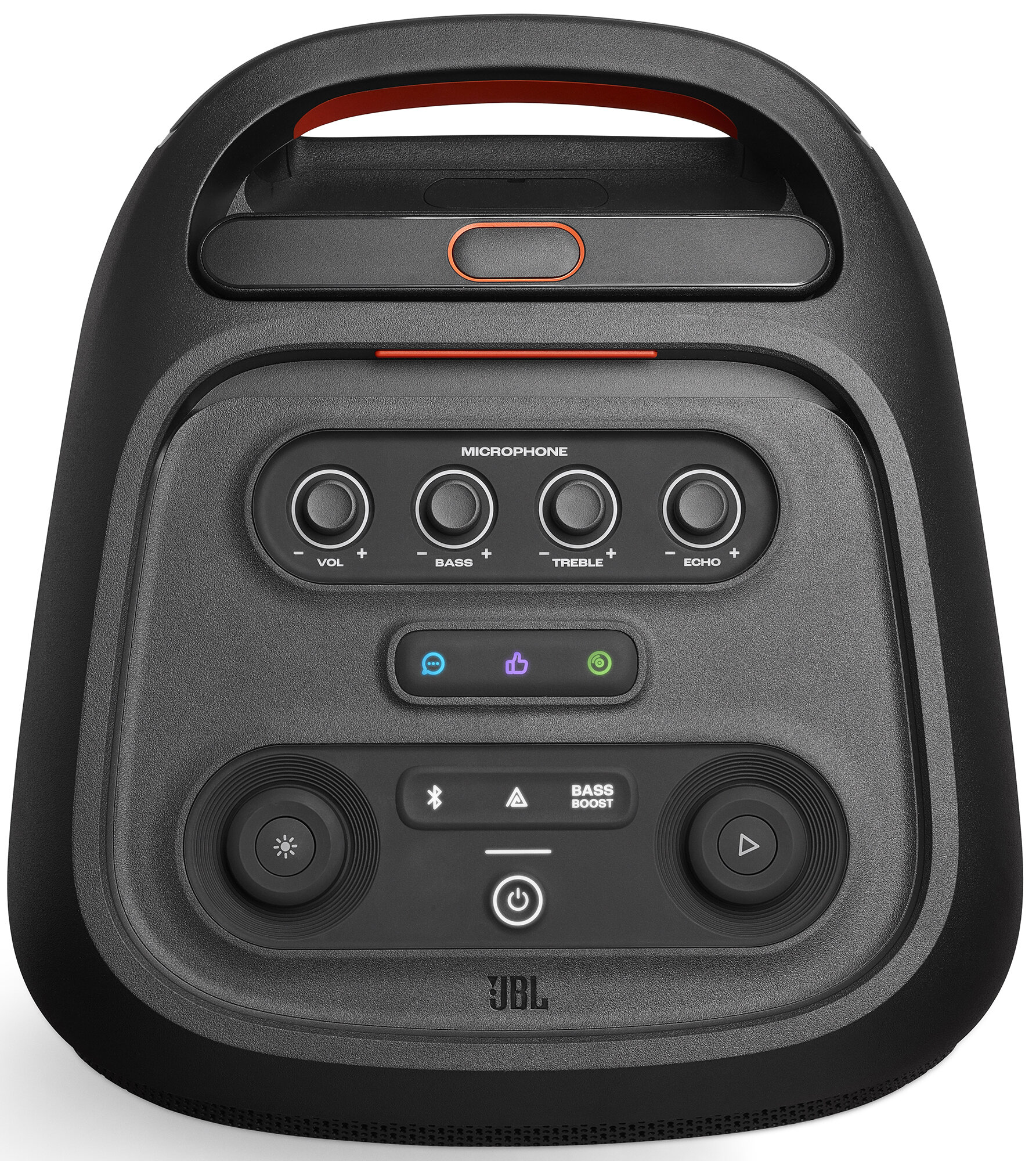 Przenośny głośnik imprezowy z potężnym brzmieniem JBL Pro Sound, adaptacyjnymi efektami świetlnymi, odporny na zachlapania, z wymiennym akumulatorem, teleskopowym uchwytem i kółkami