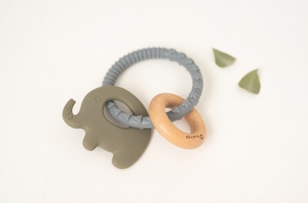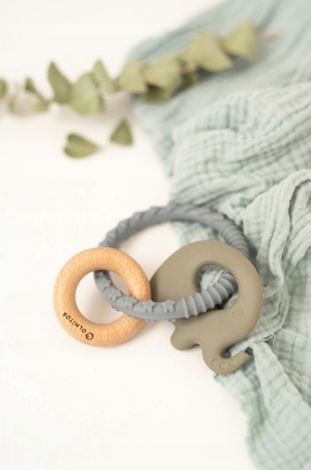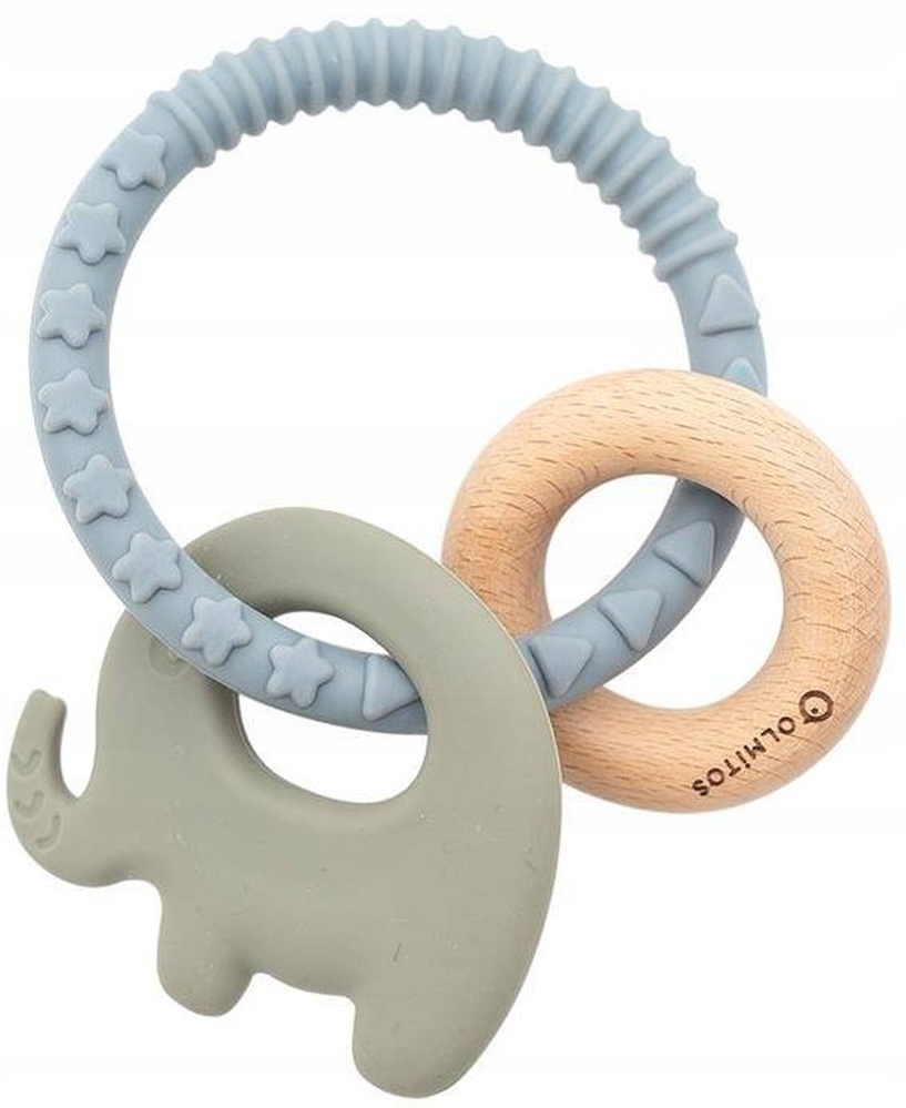 Gryzak silikonowo-drewniany Olmitos słoń zielony z kółkiem Łagodzi ból