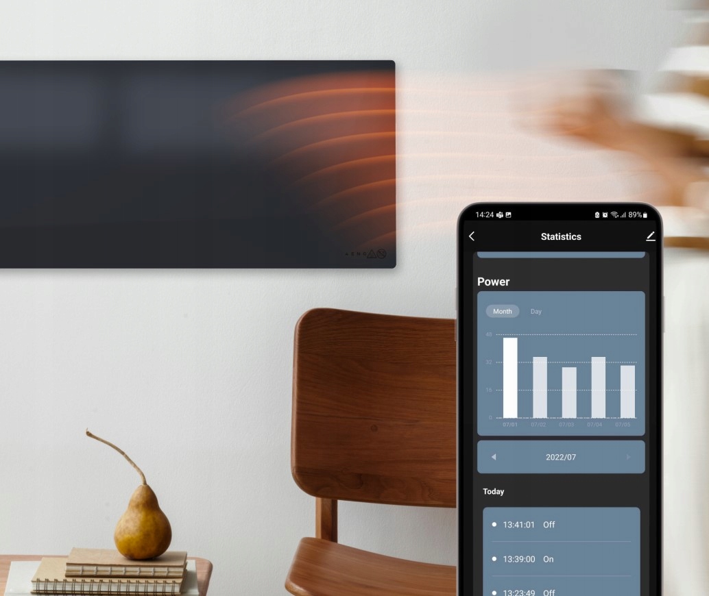 Dzięki zainstalowanej aplikacji AENO, masz możliwość zsynchronizowania pracy wszystkich urządzeń AENO oraz kontrolowania ustawień każdego z nich. Aplikacja umożliwia monitorowanie zużycia energii elektrycznej, co pomaga unikać wzrostu rachunków za prąd. W najbardziej efektywnym trybie, grzejnik może oszczędzać nawet do 50% energii.