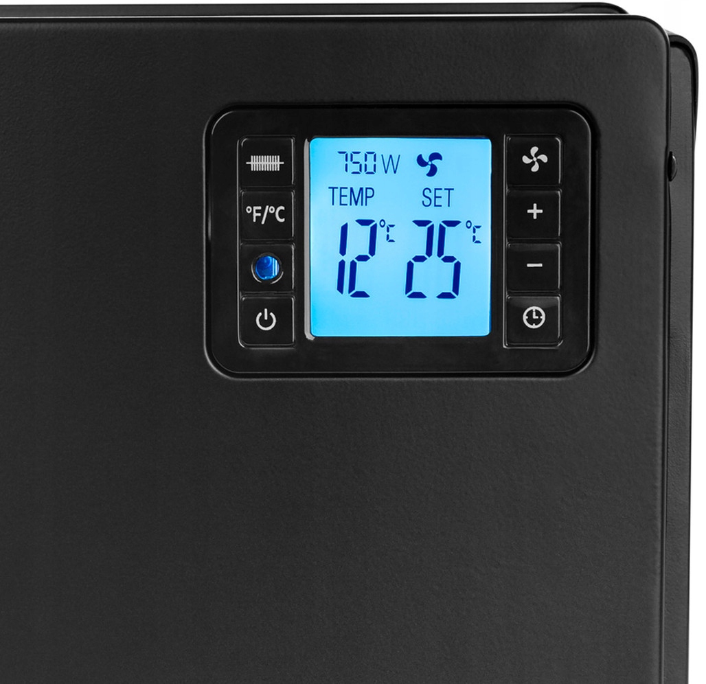 Grzejnik konwektorowy CH7100 LCD SMART Black został zaprojektowany i wykonany tak, aby pasował do każdego rodzaju pomieszczenia. Urządzenie wyposażone jest w wyświetlacz LCD, który wskazuje aktualną oraz zaprogramowaną temperaturę w pomieszczeniu. Urządzenie posiada 3-stopniową regulację mocy, 24-godzinny programator czasowy oraz pilot zdalnego sterowania.