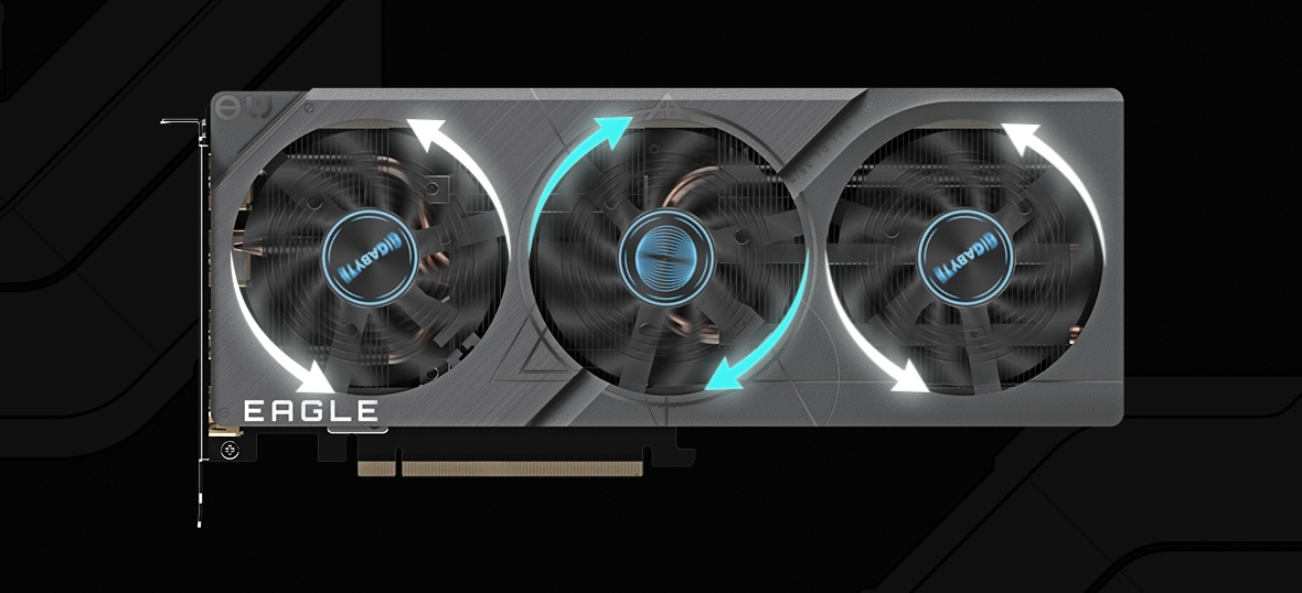 Nawet tak prozaiczna kwestia, jak kierunek, w jakim obraca się wentylator, ma ważne znaczenie dla skuteczności pracy całego układu. W przypadku Gigabyte GeForce RTX 4060 Ti EAGLE OC 8G zastosowano znane i cenione rozwiązanie, które polega na tym, że wentylator obracają się w inną stronę, niż te, z którymi sąsiaduje. Rozwiązanie to pozwala zredukować turbulencje występujące na sąsiadujących wentylatorach oraz zwiększyć ciśnienie przepływu powietrza. Pozwala to dostarczyć większy wolumen samego powietrza do karty i schłodzić ją skuteczniej.