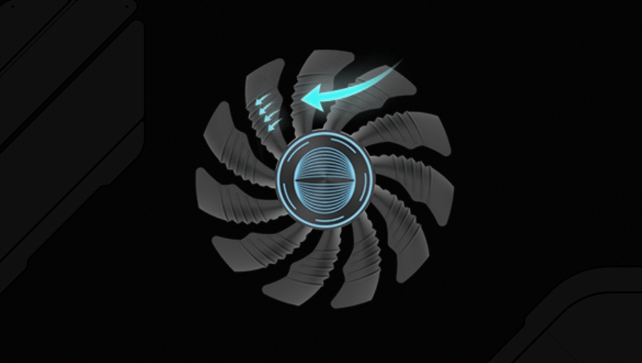 W wydajnym chłodzeniu potężnej karty wszystko ma znaczenie – również to, jak zaprojektowane zostały wentylatory. Kształt ich łopatek wymodelowano tak, aby ich końce przypominały kształtem trójkąty – pozwala to na niczym niezakłócony przesył mas powietrza wzdłuż całej długości każdej łopatki, aż do wnętrza układu. Specjalne uformowanie każdej łopatki w okolicach mniej więcej środka, to zabieg, który wzmacnia cały proces – w ten sposób masz pewność, że do wnętrza karty dociera maksimum powietrza.