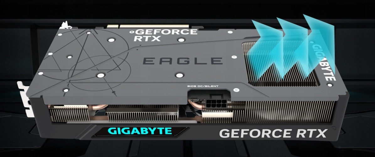 Po pierwszym wyjęciu GIGABYTE GeForce RTX 4070 EAGLE OC 12G z opakowania, Twoje oczy z pewnością docenią wykonanie backplate’u w tym modelu. Jego kształt i dodatki z pewnością mogą się podobać, ale pod tym kryje się znacznie więcej. Metal, z którego go wykonano, jest bardzo wytrzymały, co przekłada się na wzmocnienie całej konstrukcji. Przy okazji czułe elementy karty graficznej zyskują odpowiednią protekcję, tak ważną w przypadku delikatnych części urządzenia.