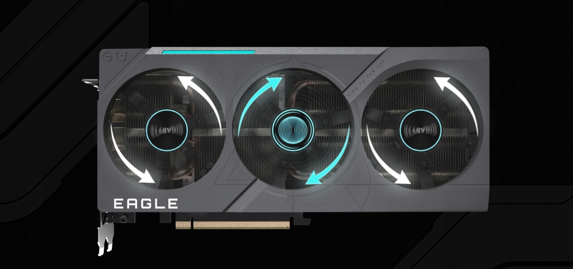 Trzy 90 milimetrowe wentylatory z unikatowymi łopatkami, alternatywne obroty na każdym wentylatorze (względem sąsiedniego), 5 miedzianych ciepłowodów z kompozytu, komora parowa będąca w bezpośrednim kontakcie z procesorem graficznym oraz chłodzenie półpasywne 3D Active i Screen Cooling – to wszystko razem dba o utrzymanie odpowiedniej temperatury. Chłodzenie Windforce wspomagane odpowiednimi rozwiązaniami sprawia, że GIGABYTE GeForce RTX 4070 EAGLE OC 12G pozostaje zawsze tak samo chłodny i tak samo wydajny. Bez względu na obciążenie, jakiemu go poddajesz.