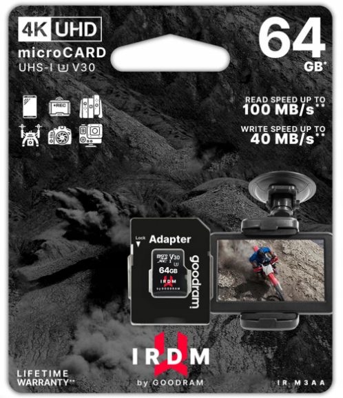 Dzięki klasie szybkości UHS-I U3 oraz klasie szybkości Video V30, karta IRDM pozwala na uchwycenie idealnego ujęcia na każdym urządzeniu – nie ważne czy w profesjonalnym aparacie fotograficznym, kamerze sportowej, dronie, przenośnej konsoli, wideorejestratorze, czy innym sprzęcie z kategorii high-end.