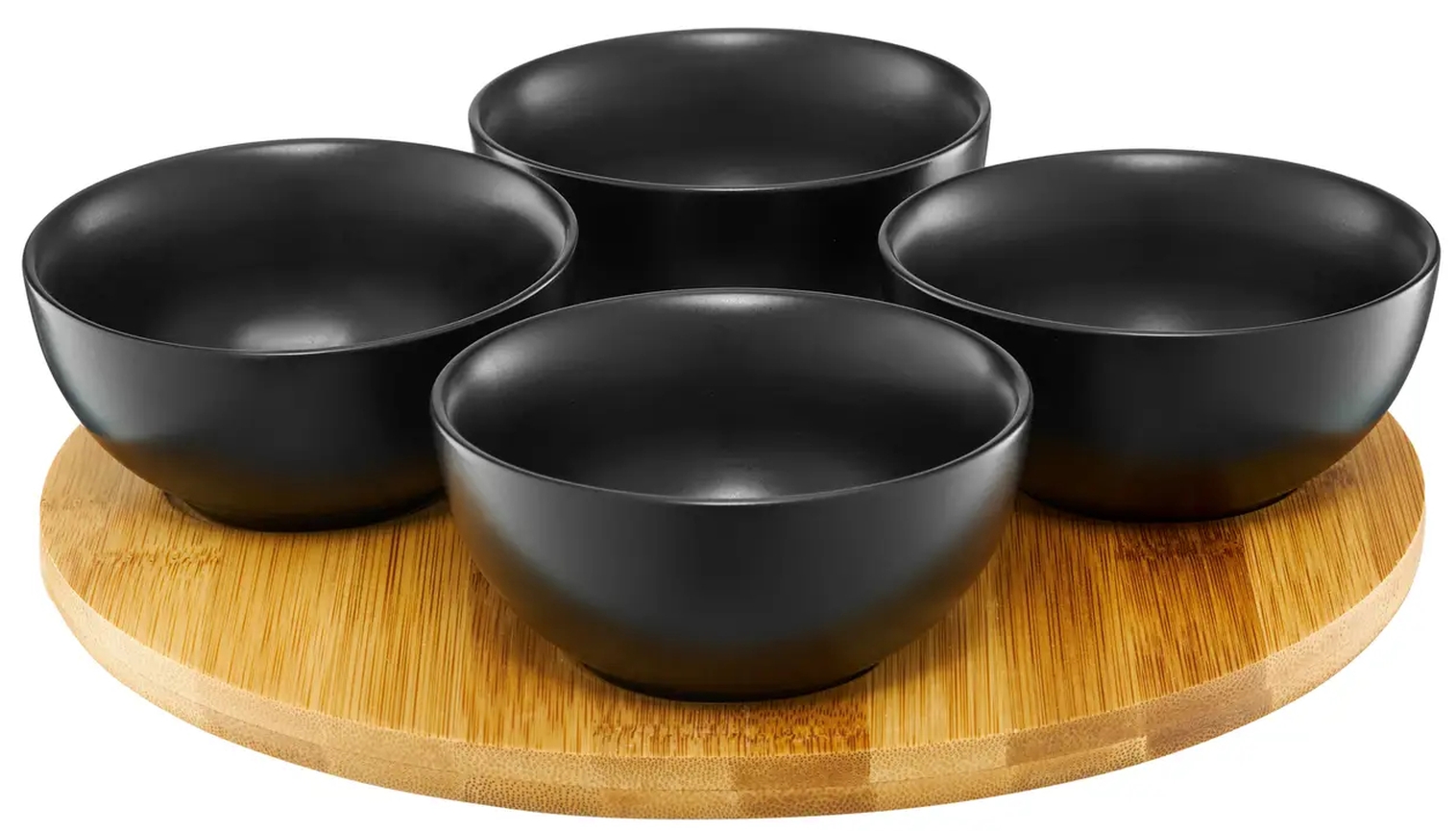 Oryginalne zestawy miseczek na bambusowej podstawce w nowej czarnej ods?onie. Niezwykle?funkcjonalne i nowoczesne. Pi?knie prezentuj? si? na stole podczas przyj?cia dla znajomych czy rodzinnej uroczysto?ci. Idealne do serwowania smacznych przystawek oraz r??nych przek?sek typu: s?one orzeszki, oliwki czy nachosy oraz dip?w. Bambusowa podstawa posiada wci?cia na palce, co bardzo u?atwia przenoszenie. Miseczki wykonane zosta?y w?wysokiej jako?ci porcelany?New Bone China, podstawka natomiast w wytrzyma?ego i odpornego na wilgo? drewna bambusowego.
