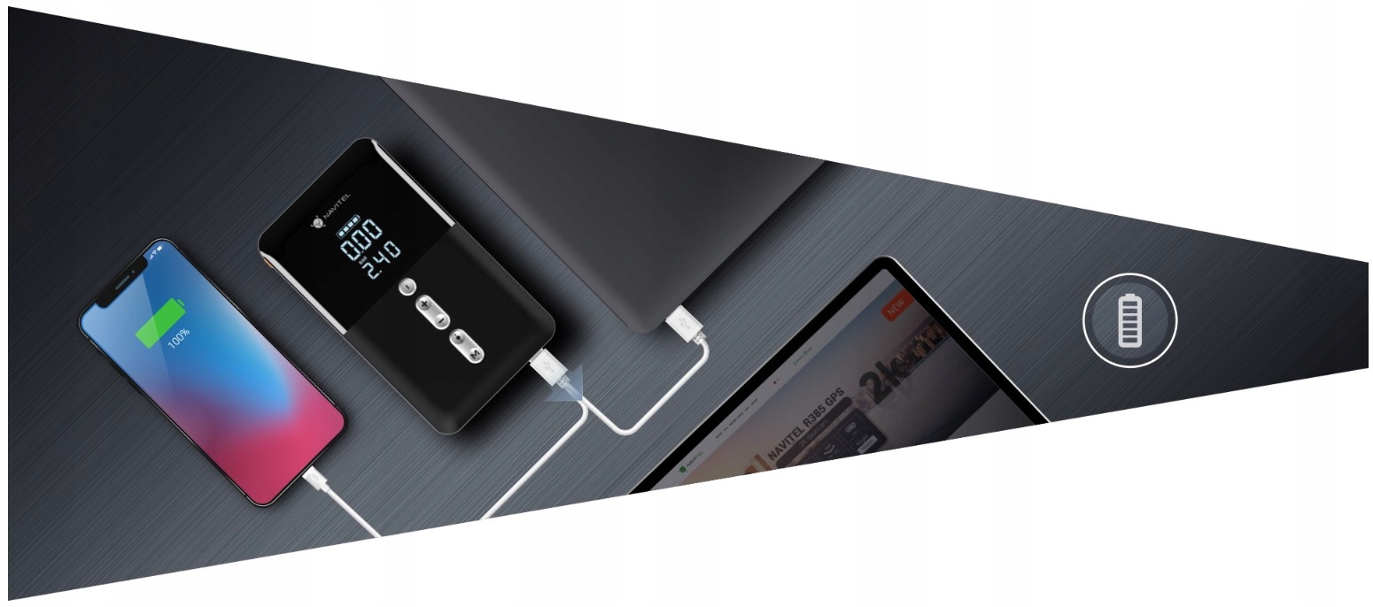 NAVITEL AIR 30 MULTI to nie tylko bezprzewodowy kompresor powietrza z automatycznym regulatorem ciśnienia, cyfrowym manometrem i wyświetlaczem LCD. Jest to wielofunkcyjne urządzenie, które napompuje koła, naładuje urządzenia mobilne, a nawet uruchomi samochód z rozładowanym akumulatorem. Dzięki wbudowanej litowo-jonowej baterii o pojemności 10 000 mAh, AIR 30 MULTI działa autonomicznie – bez konieczności podłączenia do źródła zasilania.
