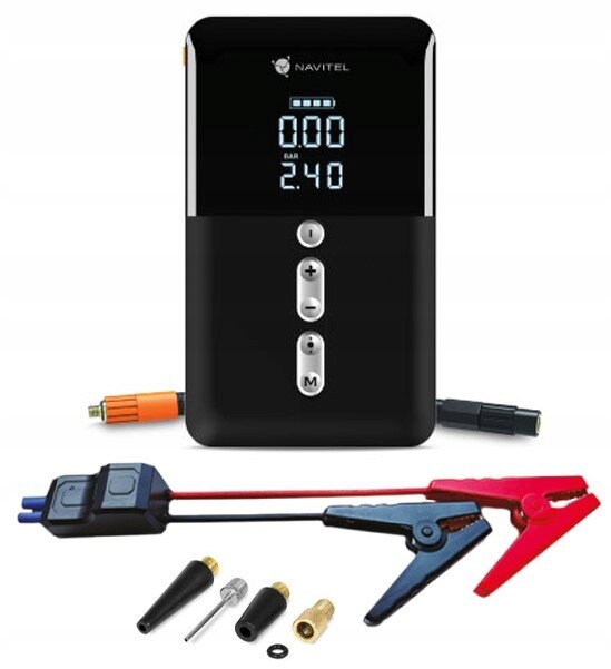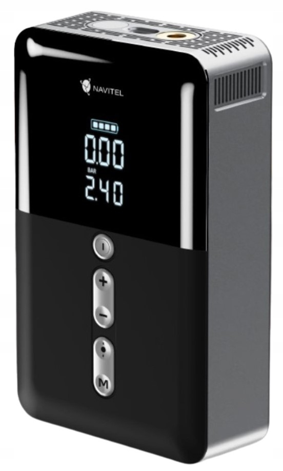 NAVITEL AIR 30 MULTI ma ekran LCD, który wyświetla aktualne ciśnienie, jednostki miary oraz poziom naładowania baterii. Ustawienia, tryby i latarka są sterowane za pomocą pięciu przycisków znajdujących się z przodu kompresora. Urządzenie posiada również 2 wyjścia USB-A 5V/2A, umożliwiające ładowanie smartfonów, tabletów, słuchawek i innych przenośnych urządzeń. Kompresor jest zasilany baterią o pojemności 10 000 mAh lub w przypadku wyczerpania się baterii, może być podłączony do gniazda samochodowego 12 V za pomocą kabla USB-C.