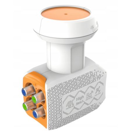Wysokiej jakości konwerter satelitarny przeznaczony do użytku z anteną satelitarną wyposażoną w uniwersalny uchwyt konwertera 40mm. Konwerter współpracuje ze wszystkimi odbiornikami DVB-S/DVB-S2. Służy do odbioru programów satelitarnych nadawanych w paśmie Ku. Zalecany również do odbioru programów w jakości UHD/4K. Wyposażony w cztery wyjścia F do podłączenia do czterech dekoderów/telewizorów lub dwóch urządzeń z tunerem TWIN.