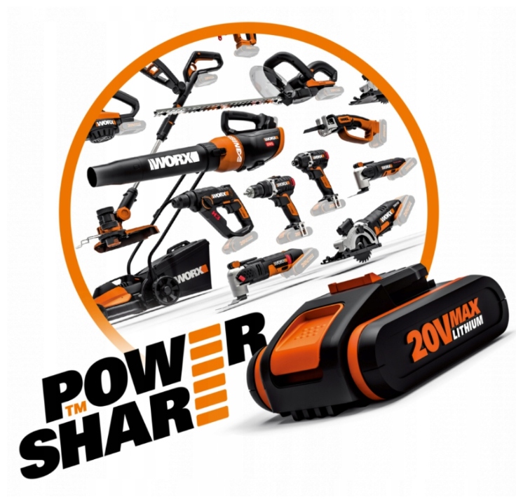 Dzięki WORX PowerShare możesz używać tej samej baterii do wszystkich bezprzewodowych elektronarzędzi i narzędzi ogrodowych marki WORX.
